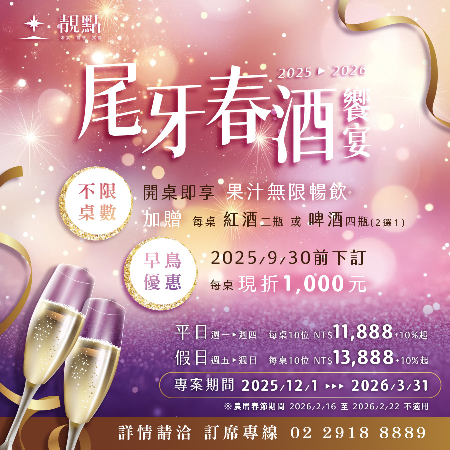 靚點飯店位於新北市新店區,提供婚宴、會議、宴會、尾牙春酒、除夕圍爐等多元場地選擇,適合工商活動、私人宴會、喜宴餐廳等需求,打造專屬宴會體驗!
